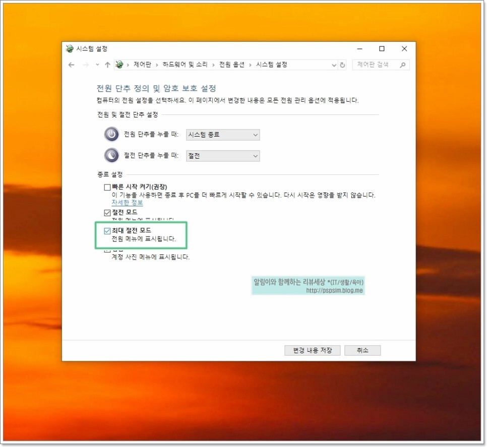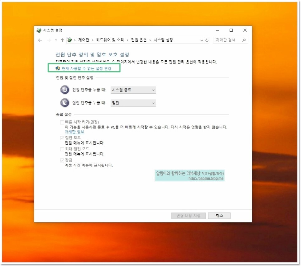 그러면 위와 같이 체크박스가 활성화가 되는데 여기서 해제를 해 주면 종료버튼을 눌렀을 때 윈도우10 최대절전모드 설정 해제 할 수가 있습니다.