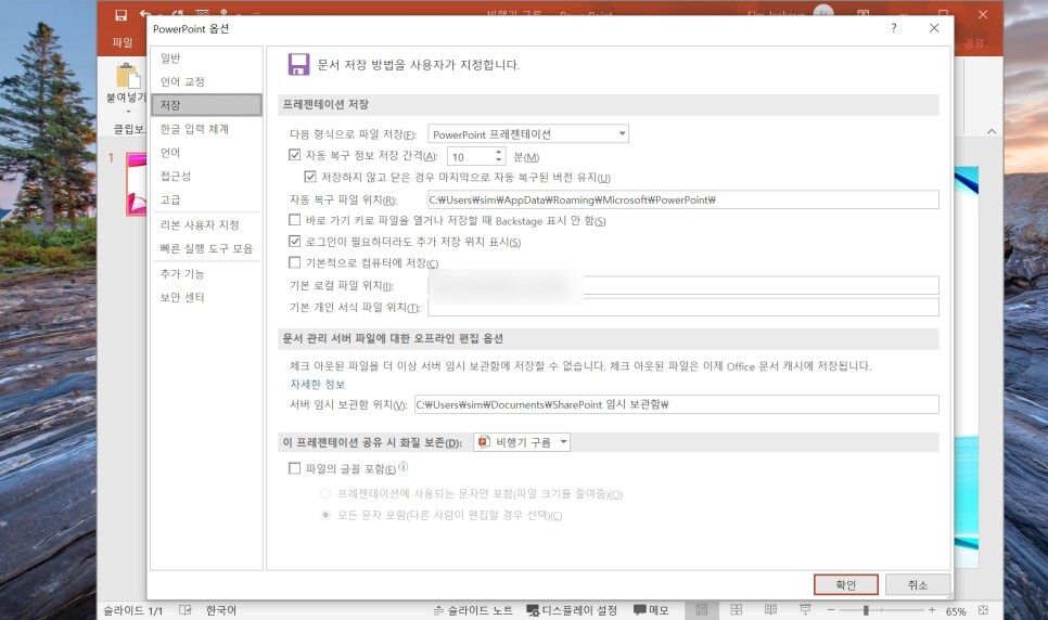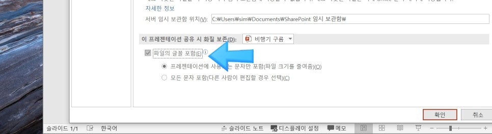 여기에서 이 부분에 체크해주시면 파워포인트 글꼴 포함 저장하여 프레젠테이션 파일이 저장이 됩니다.