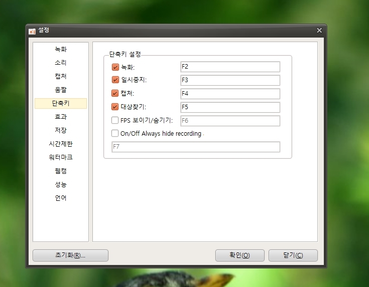 그다음에는 단축키를 설정 해 주세요. 왜냐하면 화면을 즉시 녹화했다가 일시 중지, 또는 녹화를 멈추어야 할때 굳이 커서를 옮길 필요없이 곧바로 녹화를 조정할 수가 있기 때문이죠. 기본값들은 위로 설정되어 있으니 다른 것을 쓰지 않는다면 크게 건들지 않으셔도됩니다.