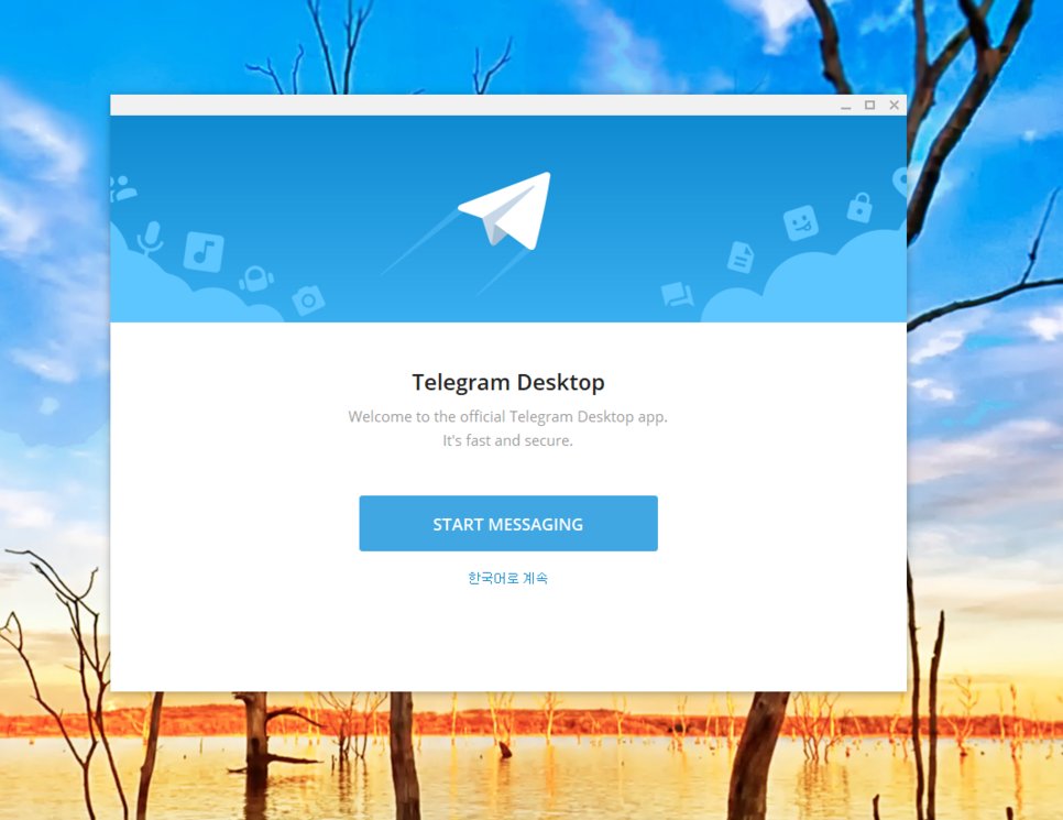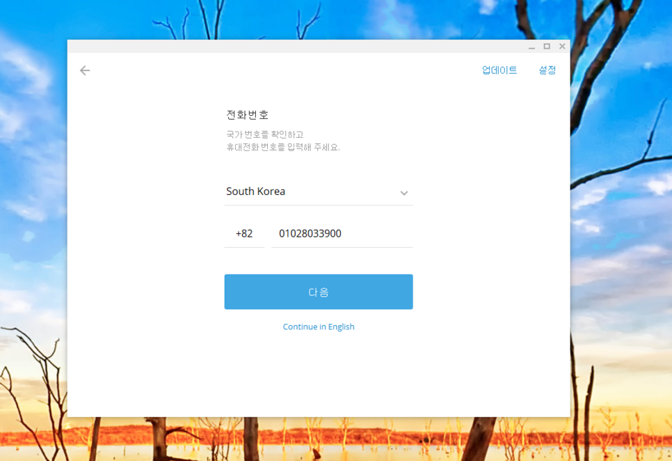 그리고 나면 텔레그램 pc버전 프로그램이 다운이 되고 이것을 설치 하면 되는데 여기서 처음에는 영어밖에 선택을 하지 못하지만, 중간에 한국어로 계속 눌러 주면 한국어로 변환이 됩니다.