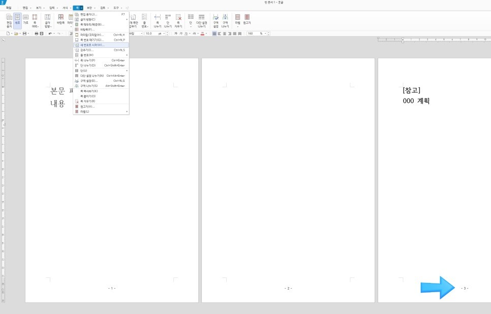 그럴 때는 새 페이지번호로 시작할 문서에서 위에서 보았던 그 메뉴에서 "새 번호로 시작"을 선택 해 주면 1페이지부터 다시 시작됩니다. 위의 3페이지가 1페이지로 바뀌는 것이지요.