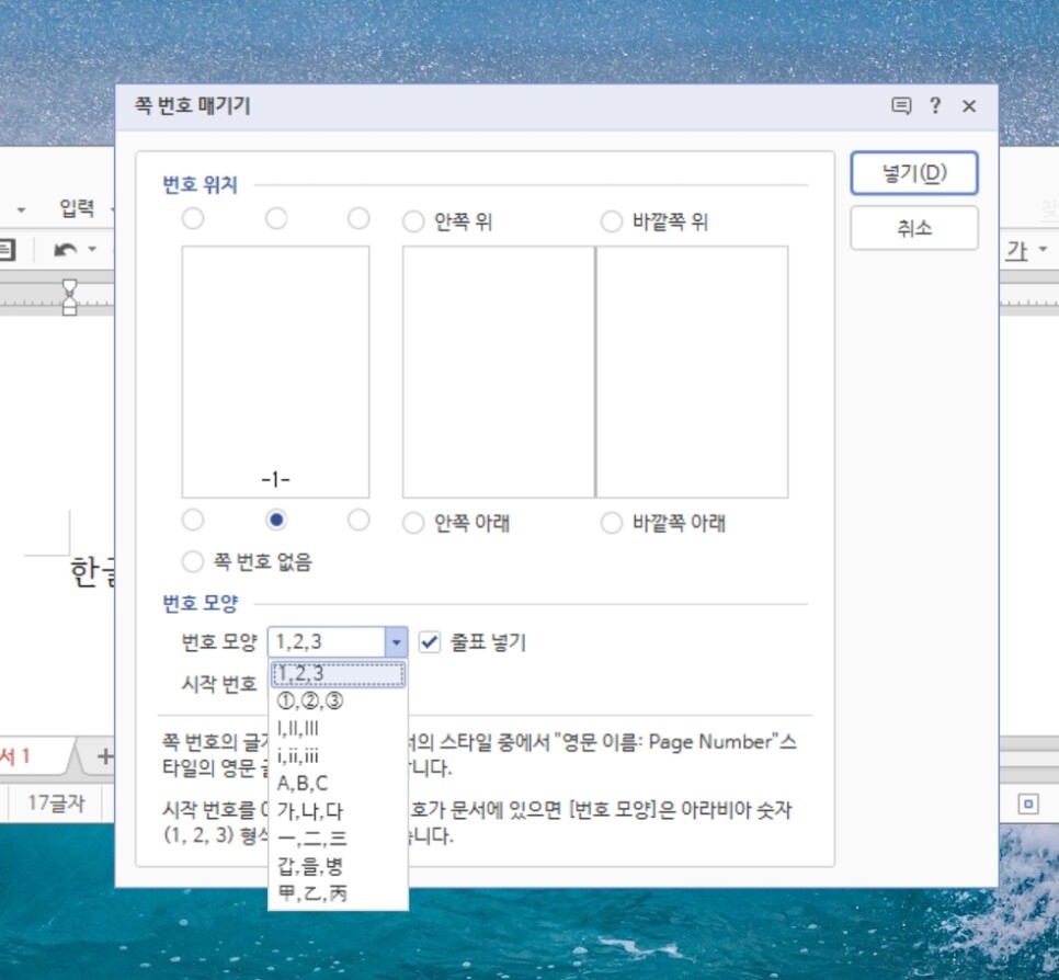 그러면 위와 같이 화면에 나오는데 여기서 쪽번호 스타일을 1,2,3 으로할지 I, II, V 이런식으로 할지를 정할 수가 있습니다.