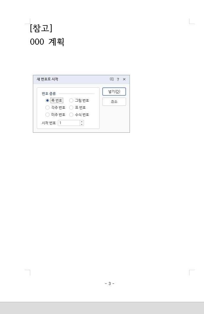 그런데 이렇게 하다보면 중간에 붙임자료나 참고자료가 들어가게되는데 이때 다른 문서를 삽입하다보니 새로운 쪽번호로 시작하고 싶을때가 있습니다.