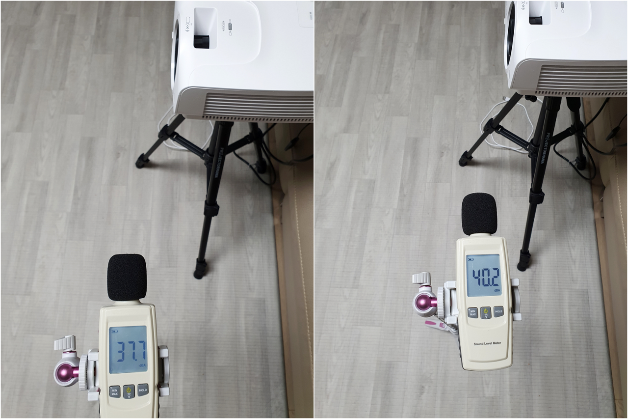 집에서 빔프로젝터를 처음 사용하는 사람들이라면 커다란 팬소음에 놀랄때가 있다.비비텍 약 30cm 거리에서 측정시 작동시 소음은 40.2db 로서 평상시 소음 37.6db에 비해 약 2.4db 정도 증가한 것을 보인다. 바로 옆에서 본다면 거슬릴 수 있으나 거리를 두고 영상의 소리를 조금 높여준다면 크게 거슬리지 않을 것이다.