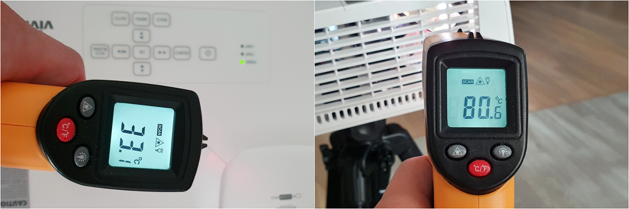 일반적으로 빔프로젝터들이 열이 많이 발산된다. 비비텍의 경우 보드 상체는 약 33도, 측면의 배기구를 통해서 배출되는 열기는 최대 80도를 기록하였으며 일반적인 수준을 보여준다.