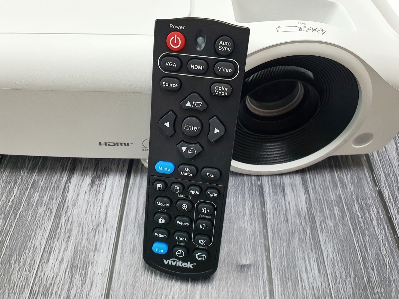 같이 제공되는 리모컨은 자주 사용하는 기능을 잘 배치해 놓았으며, 아래쪽에는 마우스버튼, 페이지업/다운, 확대 등 프레젠테이션에 필요한 기능들도 추가적으로 구성되어 여러모로 편리하다.