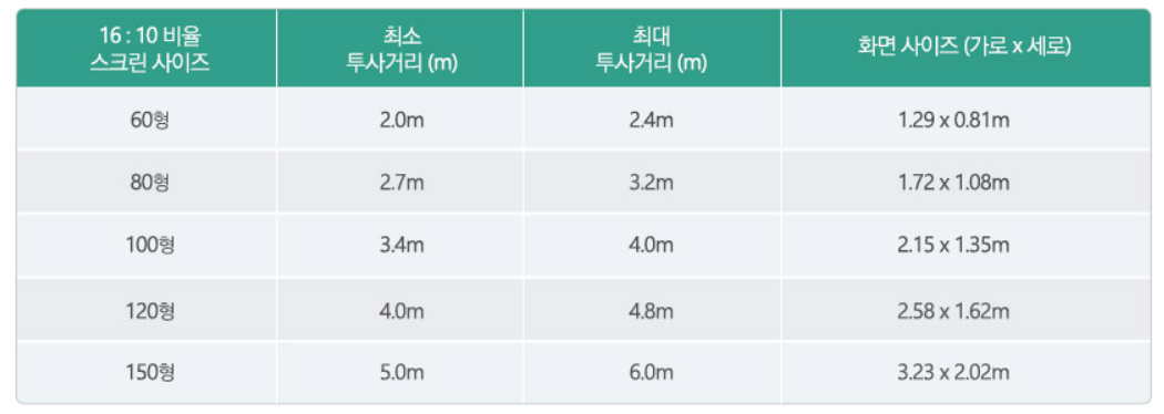각 스크린 사이즈별로 최소 투사거리는 위와 같으며, 실측 해 본결과 약 5.4m의 거리에서 약 130인치(가로 278츠) 정도의 스크린 사이즈를 투사할 수 있었다. 50명 이상이 수용 가능한 강당에서도 대형 스크린으로 뚜렷하게 하나하나 보여진다.