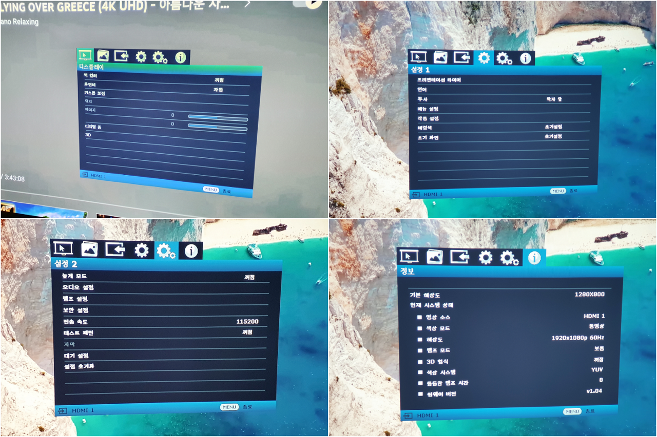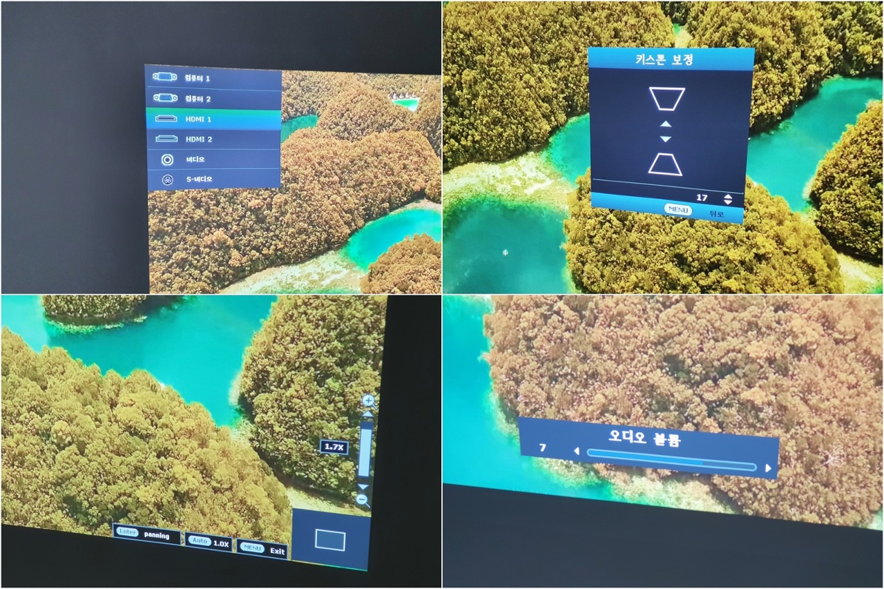 스크린 설정화면에서는 디스플레이와 오디오에 관한 여러가지 설정을 할 수 있다. 이미지 색상모드 프레젠테이션, 동영상, 밝음모드 등으로 변경할 수 있으며 키스톤 조정, 밝기, 명암비 등을 자유롭게 조정할 수 있다.