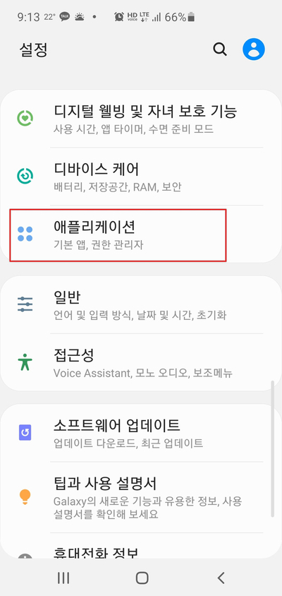 핸드폰의 설정에 들어가서 앱 또는 애플리케이션 이라는 메뉴로 들어갑니다.