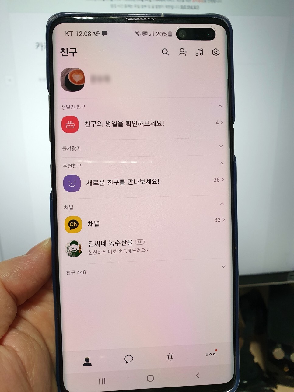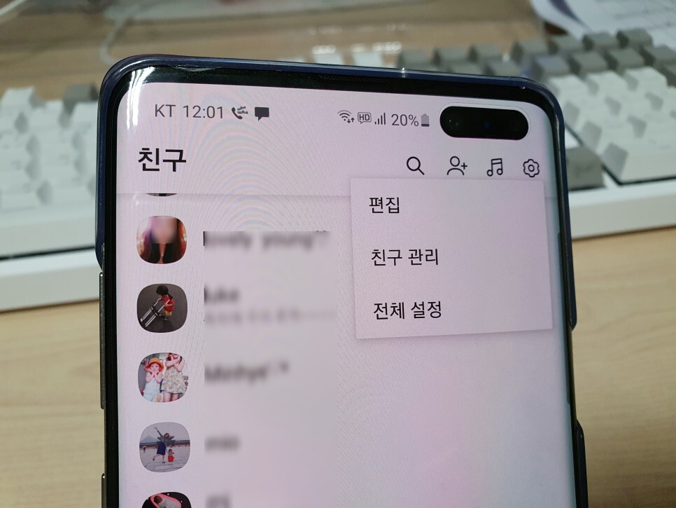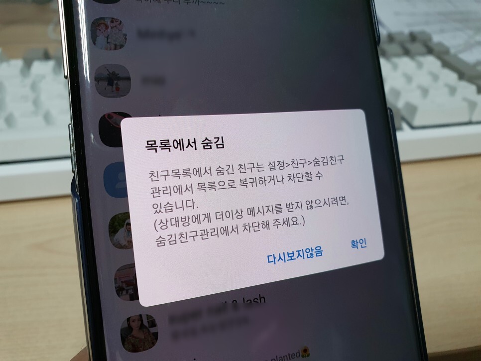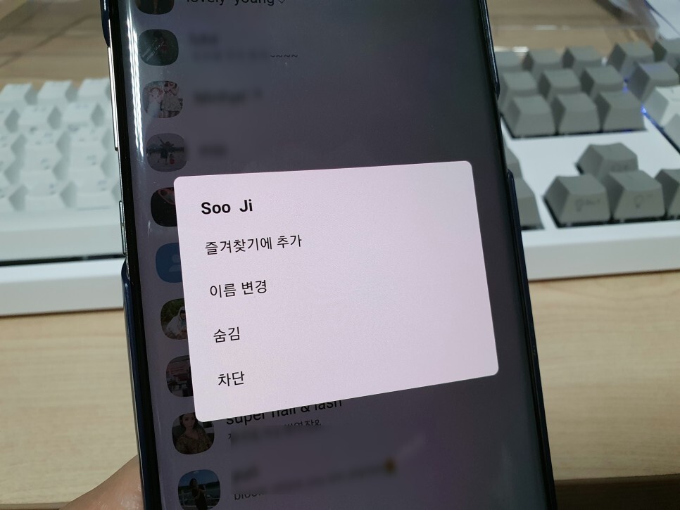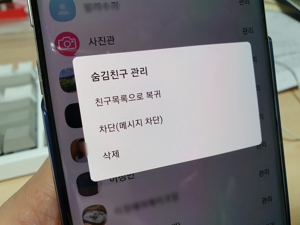 먼저 친구 리스트에서 숨기고 싶은거나 차단하고 싶은 사람을 꾹 눌러 줍니다.