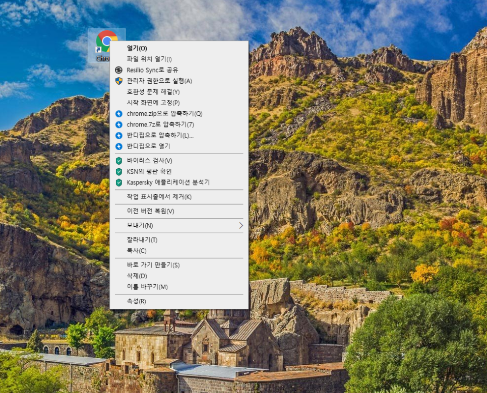 크롬 바로가기에서 마우스 오른쪽 버튼을 눌러줍니다.