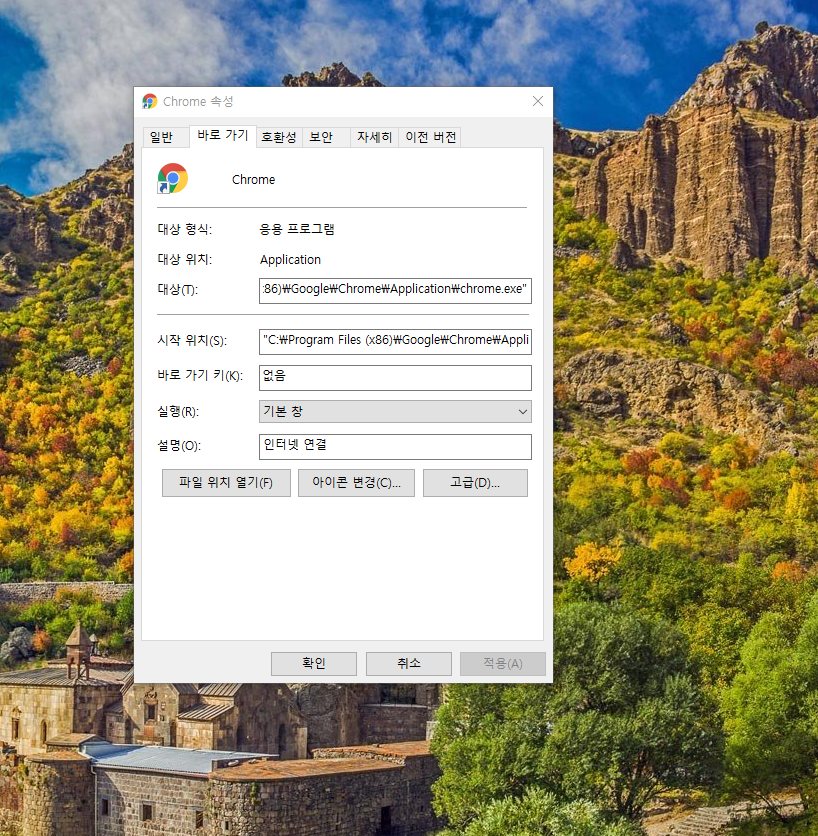 그러면 속성창이 나오고 위에 바로가기탭 오시면 들어가 줍니다.