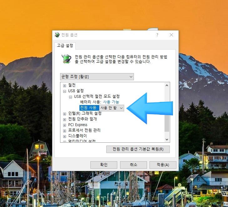 여기에서 USB설정에 들어가보면 USB 선택적 절전 모드 설정 옵션이 잇는데 여기에서 사용안함으로 바꿔주면 됩니다.