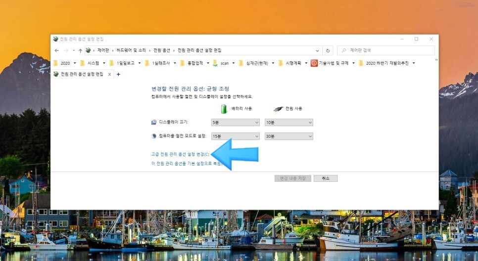 그러면 위와 같이 배터리 사용시와 전원 모드 사용시의 변경할 옵션들이 나오는데 여기서 “고급 전원 관리 옵션 설정 변경”을 눌러줍니다.