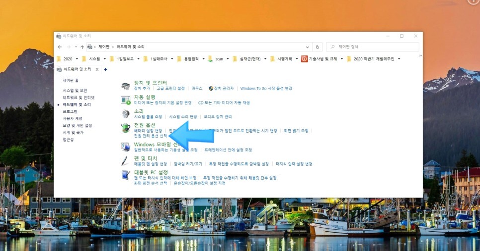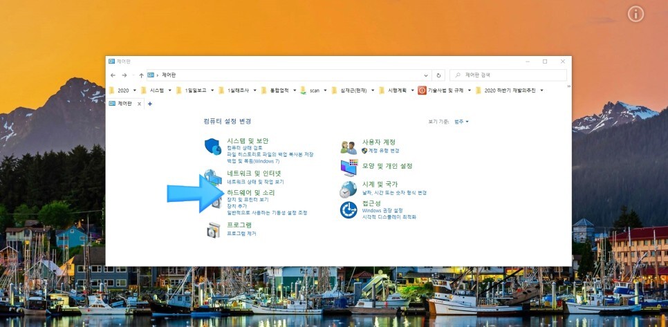 먼저 제어판에 들어가서 “하드웨어 및 소리”를 눌러주세요.