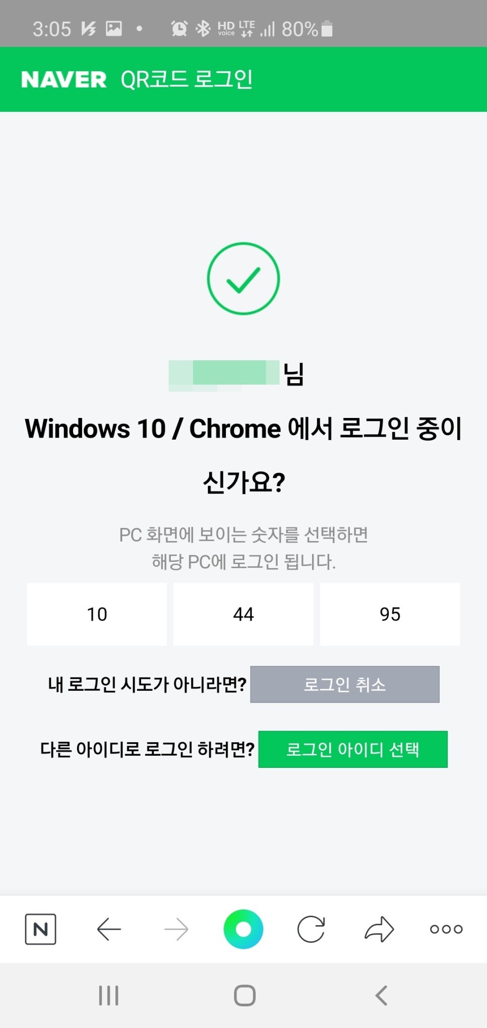 이때 PC화면에 나온 숫자를 선택 해 주면 곧바로 QR로그인이 된답니다.