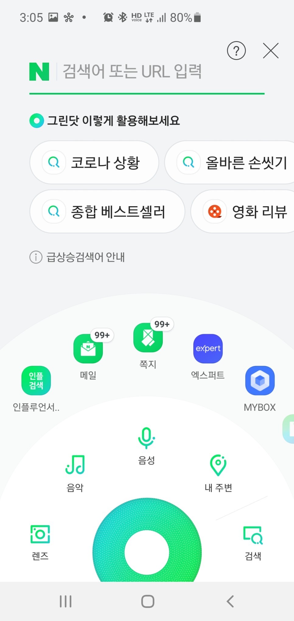 이제 저 QR코드를 스마트폰의 네이버앱에서 인식을 해 주어야 하는데요. 네이버앱을 실행시켜주고 하단의 가운데 동그라미를 눌러줍니다.