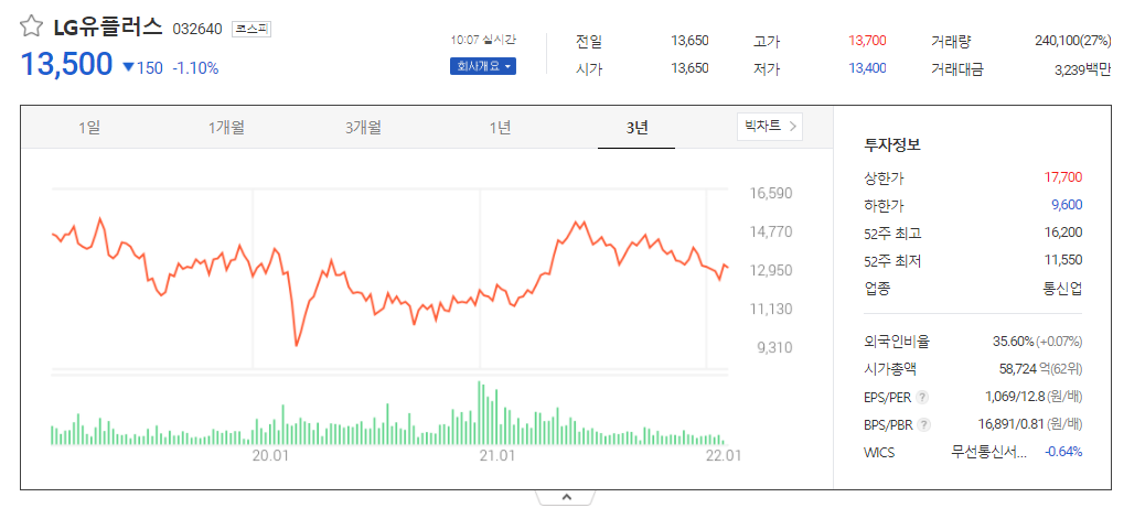 LG유플러스의 주가는 최근 3년간 내리막길을 걷다가 21년 2/4분기부터 반등한 후 최고점을 찍고 점점 하향추세입니다.