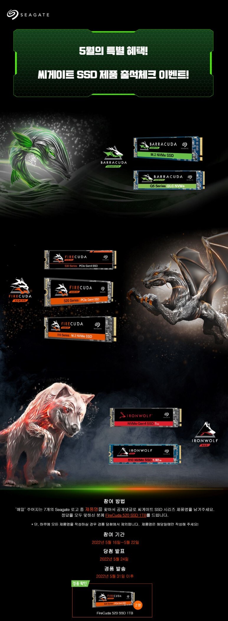 [진행 중]5월의 특별 혜택!씨게이트 FireCuda 520 SSD를 가질 수 있는 출석체크 이벤트!