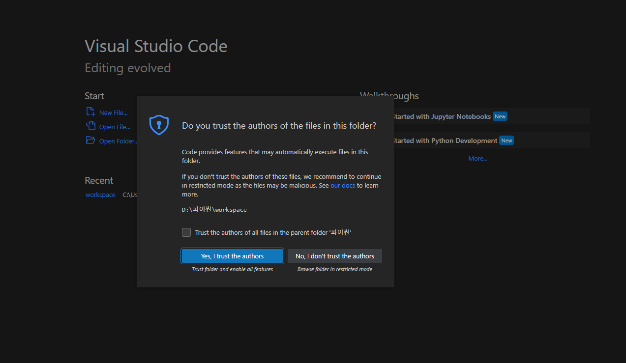 믿을 수 있는 폴더냐고 물어보면 "yes, I trust the Authors" 라는 것을 선택합니다.