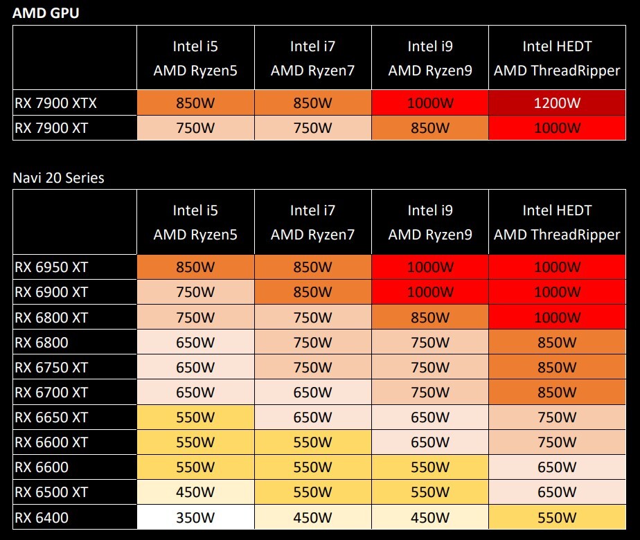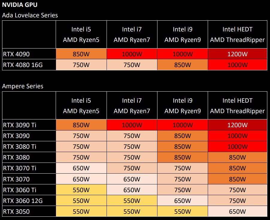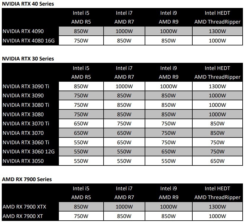 MSI 는 ASUS 제조사보다 고사양인 RTX 4080의 경우 i7 및 R 7과 같이 사용할 때 100W 더 높은 파워용량을 권장하고 있습니다. AMD 라데온 RX 7900 시리즈도 역시 100W 더 높게 책정하고 있으니 감안하시기 바랍니다.
