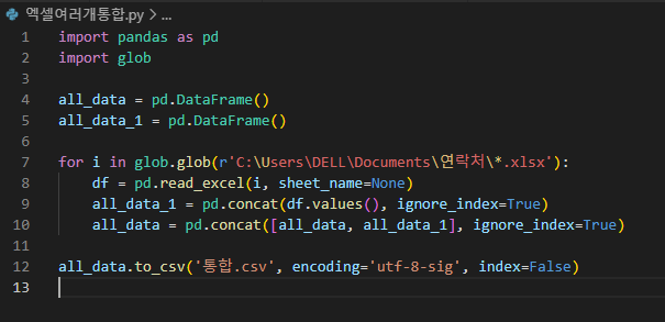 여러개 엑셀 파일 통합 합치기 파이썬 소스 코드