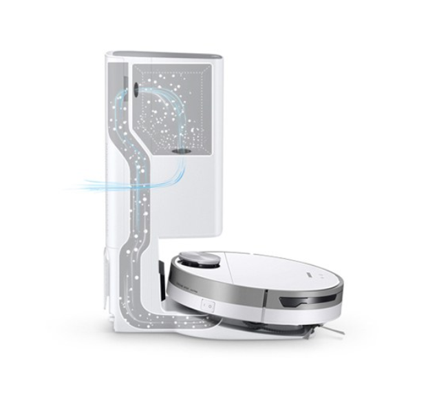 5. 스토어 및 포트 디자인: 디봇 T10은 스토어 기능으로 물걸레 청소 모드에서 사용되는 물통을 로봇 바디에 내장하여 편리한 보관과 사용을 지원합니다. 또한 커버를 열면 물통이 자동으로 떨어지는 포트 디자인으로 사용자의 편의성을 높여줍니다.