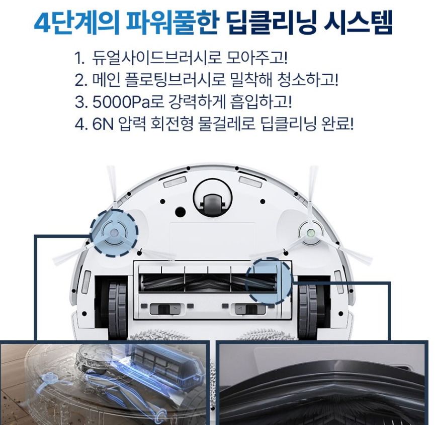 3. 스마트 터치 컨트롤: 제품은 터치 스크린을 통한 직관적인 사용자 인터페이스를 제공합니다. 다양한 청소 모드와 기능을 쉽게 선택하고 조절할 수 있어 사용자가 원하는 방식으로 청소를 조절할 수 있습니다.
