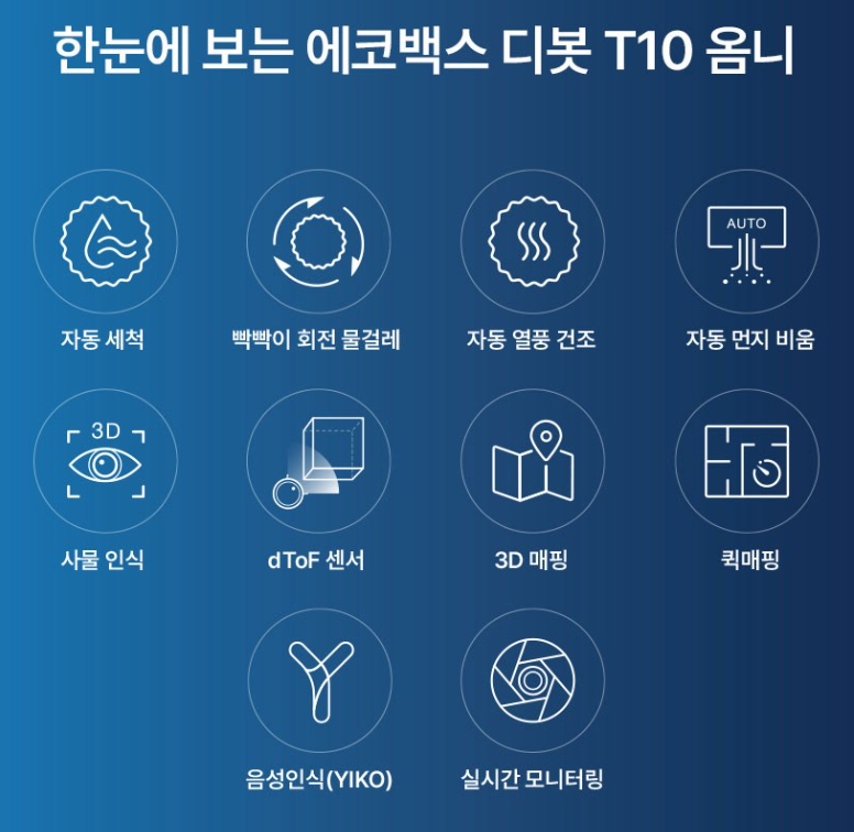 에코백스 디봇 T10 옴니 로봇청소기 DBX53은 혁신적인 특징과 스마트한 기능을 통해 사용자의 생활을 편리하게 만들어주는 제품입니다. 효율적인 청소와 스마트한 조작 인터페이스를 통해 깨끗하고 편안한 실내 환경을 구축할 수 있습니다.