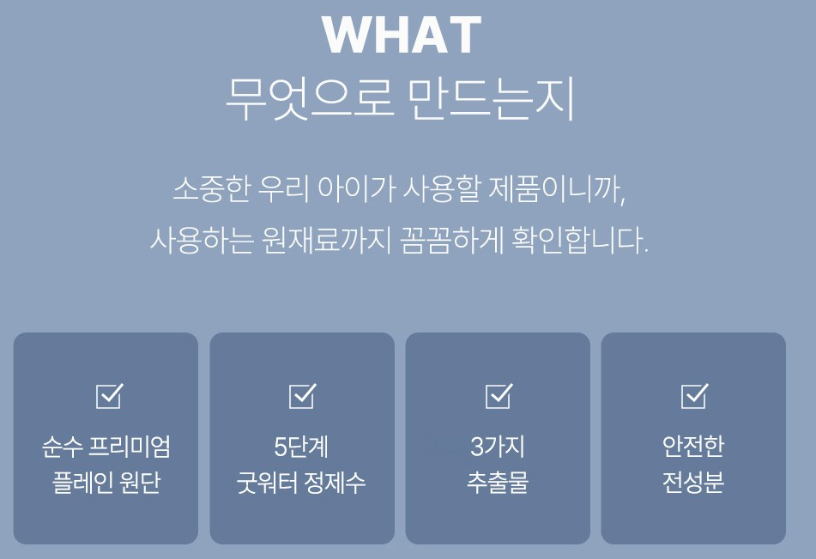 ㅇ피부 친화성 원료를 사용하여 아이의 민감한 피부에 자극을 최소화하며 철저한 청결함 제공