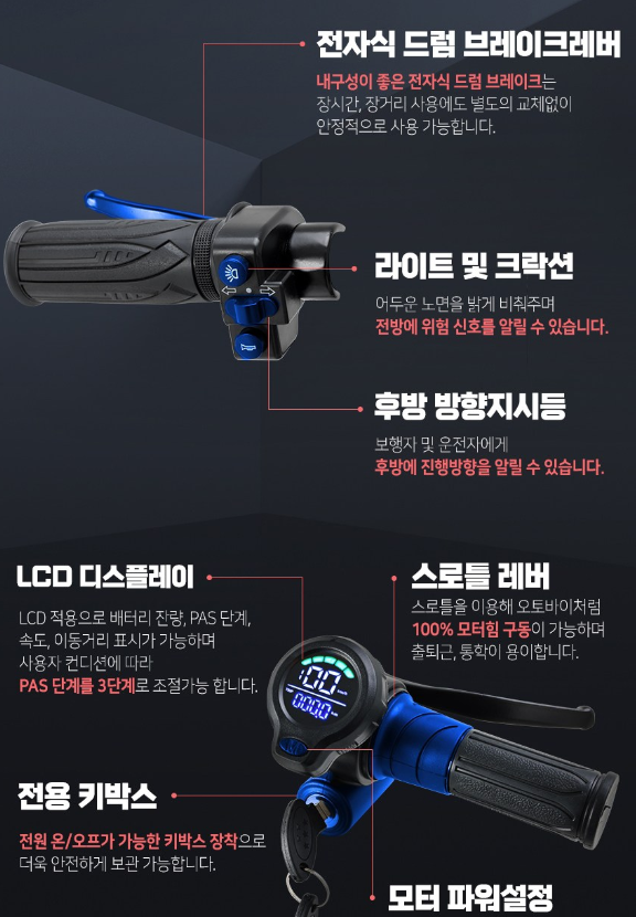 - 안정적인 브레이크 시스템과 LED 조명으로 안전을 강조합니다.