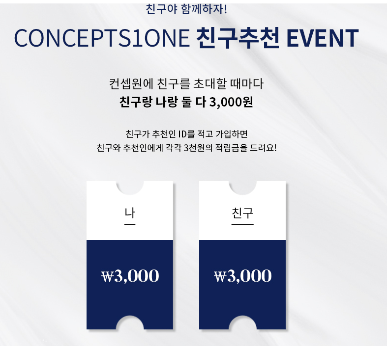 컨셉원 가입할 때 친구 아이디(추천인 아이디)를 입력하면 추천한 사람, 그리고 추천받은 사람 모두 3천원의 적립금을 받으니 반드시 가입할 때 입력하고 하세요.