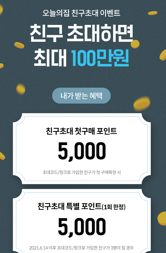 그냥 가입하면 포인트 0, 오늘의집 친구 초대코드로 가입하면 5000포인트를 받게 되니 훨씬 이익이죠?