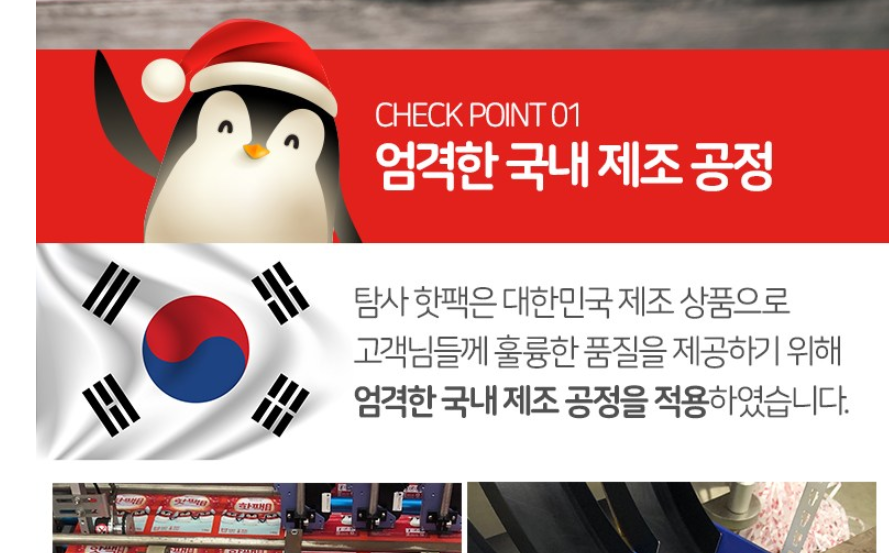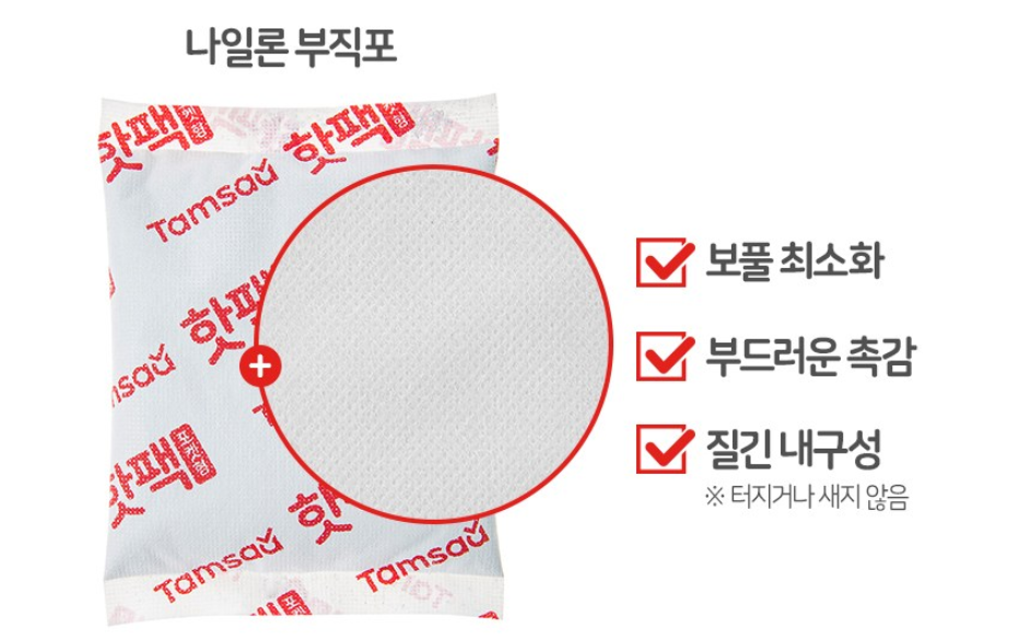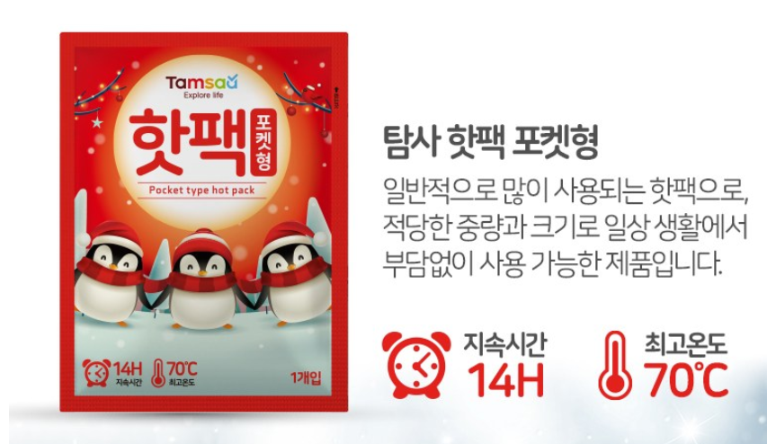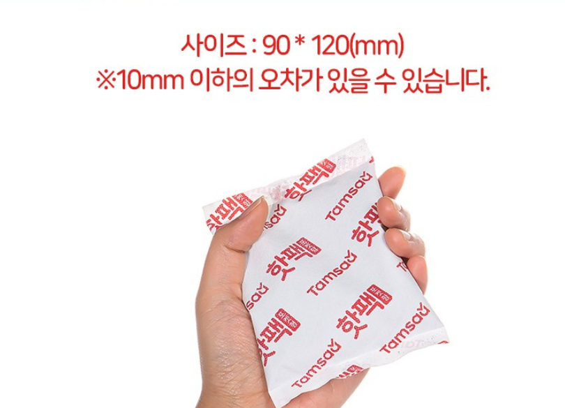 휴대용으로 디자인된 90g의 핫팩으로, 탐사 국내 생산으로 생산되었다고 설명되어 있습니다. 휴대용 핫팩은 손쉽게 가방이나 포켓에 넣고 사용할 수 있어 이동 중에도 따뜻함을 느끼기 좋습니다.