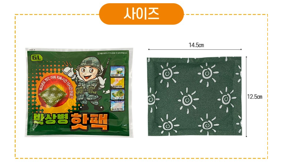 발열시간: 제품마다 다를 수 있지만, 대체로 지엘 박상병 핫팩은 일정 기간동안 따뜻함을 유지합니다.