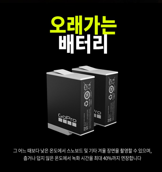 고프로 히어로 9/10/11/12 블랙용 배터리: 고프로 히어로 9/10/11/12 블랙용 본체와 호환되며, 긴 촬영 시간을 보장합니다2.
