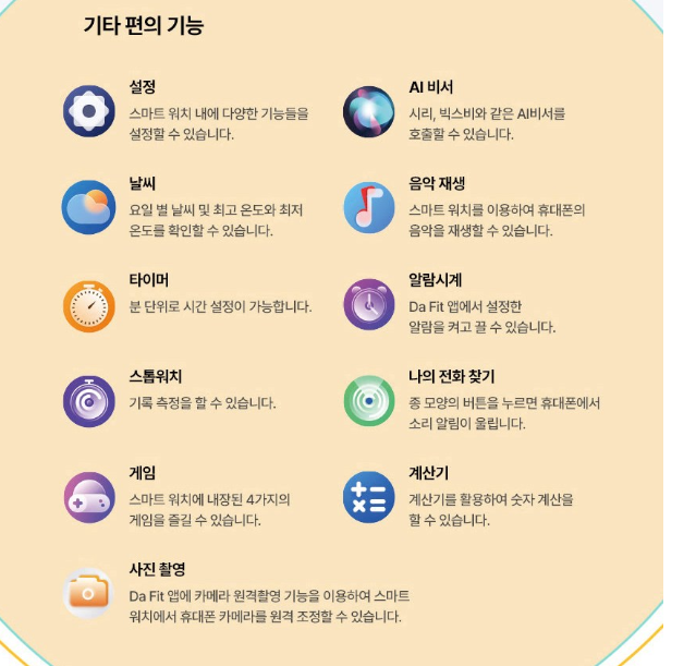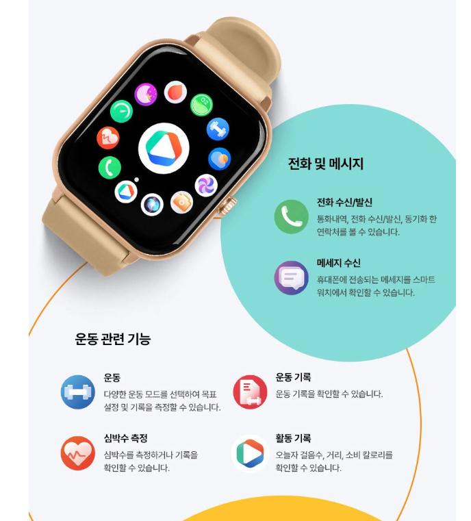 화면: 1.62인치 AMOLED 화면으로 60Hz 화면 재생율, 326 ppi, 600 nits의 밝기를 제공합니다. 스트랩은 쉽게 탈부착이 가능하며 매끈한 질감으로 디자인되었습니다.