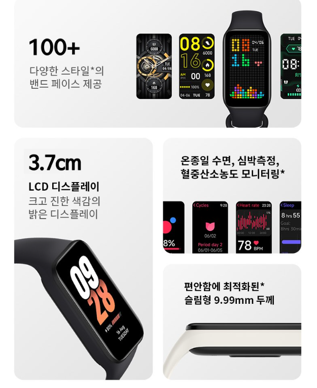 이 밴드는 가성비가 뛰어나며, 다양한 스타일과 기능을 제공하여 활용도 높은 스마트밴드입니다
