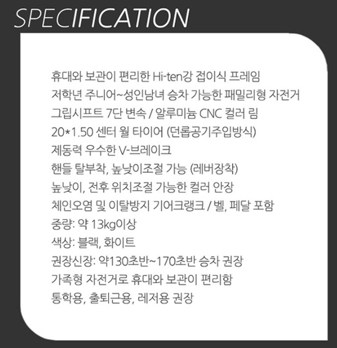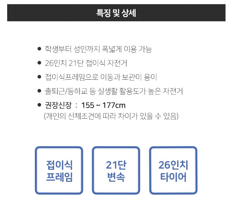 접이식으로써 일반적인 자전거보다는 약간의 무게와 공간을 차지할 수 있음.