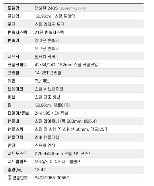 ㅇ다양한 변속 옵션: 24단 변속기가 장착되어 있어 다양한 상황에 대응할 수 있습니다. 평지나 오르막길, 내리막길에서도 안정적인 라이딩이 가능합니다.