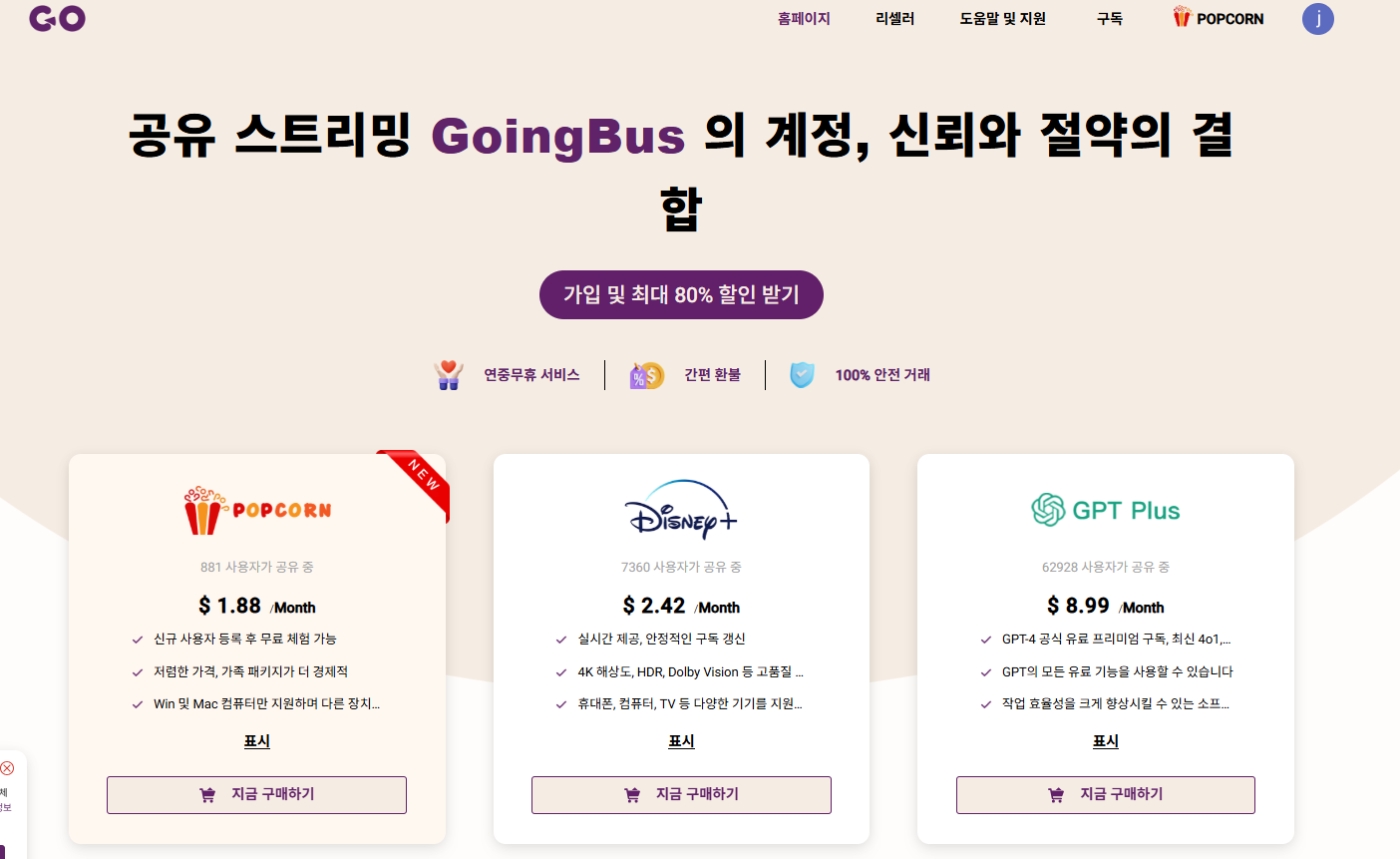 이 서비스를 이용하면 정가 대비 최대 65% 할인된 가격으로 원하는 서비스를 이용할 수 있어요! 특히, 최근 구독 서비스 가격이 인상되면서 GoingBus의 수요가 더욱 증가하고 있습니다.