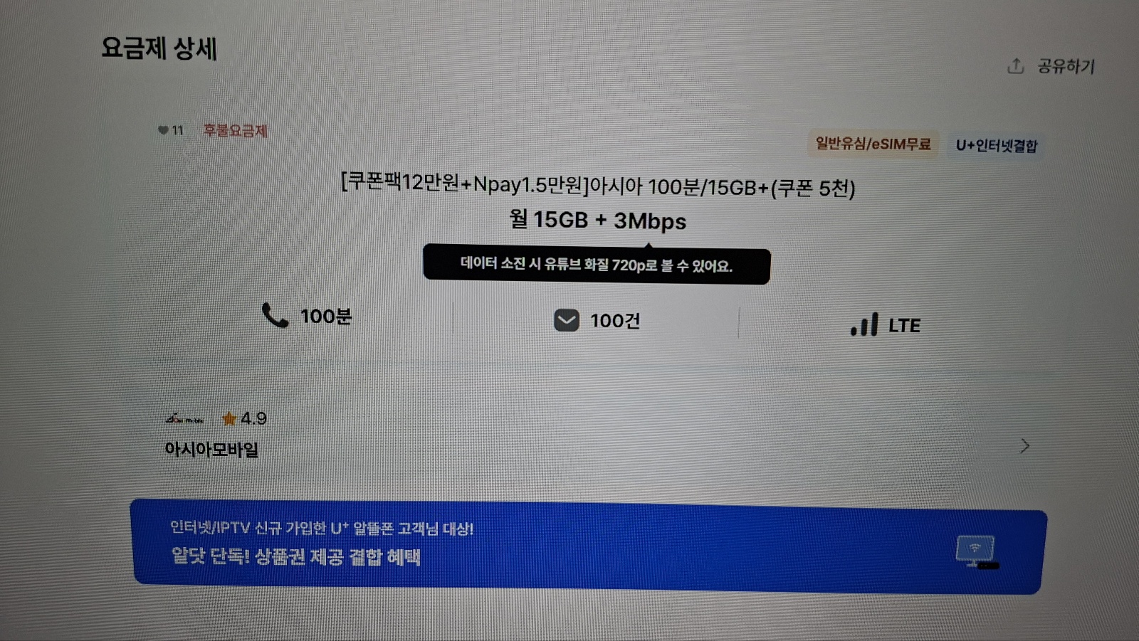 [아시아 100분 / 15GB + 쿠폰 5천원] 요금제 입니다.