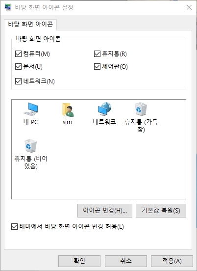 윈도우10 바탕화면 아이콘 만들기(내 PC,내컴퓨터, 제어판, 네트워크)