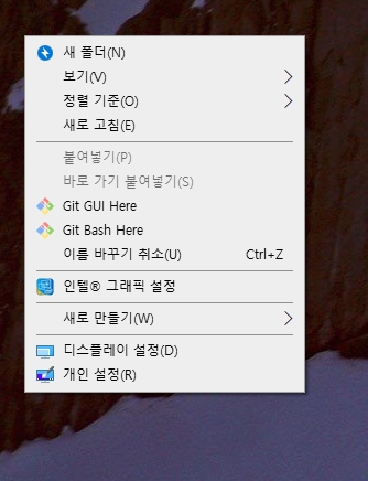 바탕화면에서 오른쪽 버튼을 누르면 위의 메뉴가 나오고 여기 제일 밑에 "개인설정"을 눌러줍니다.
