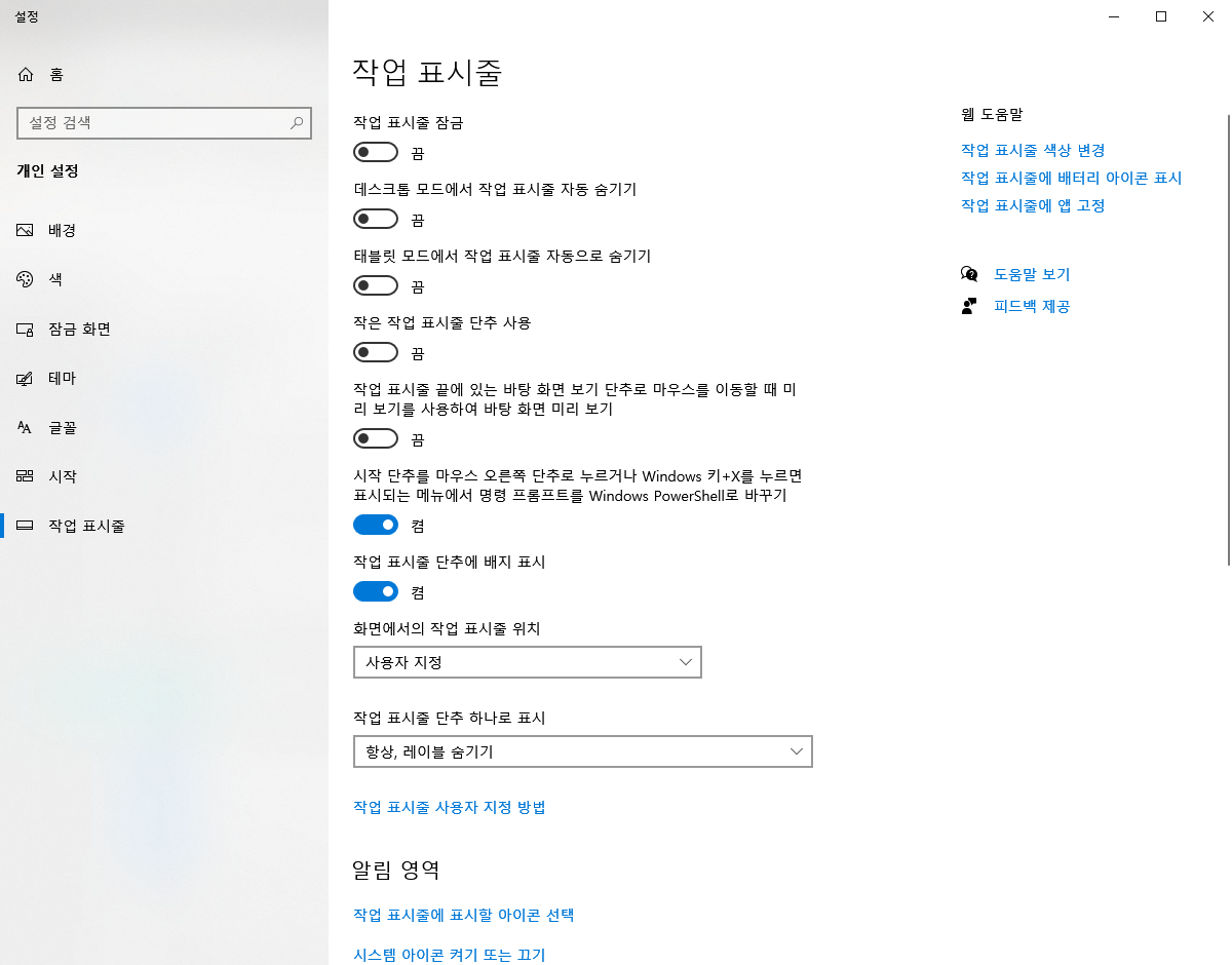 그러면 위와 같이 나오는데 여기서 제일 밑에 "작업 표시줄 설정"을 눌러주세요.