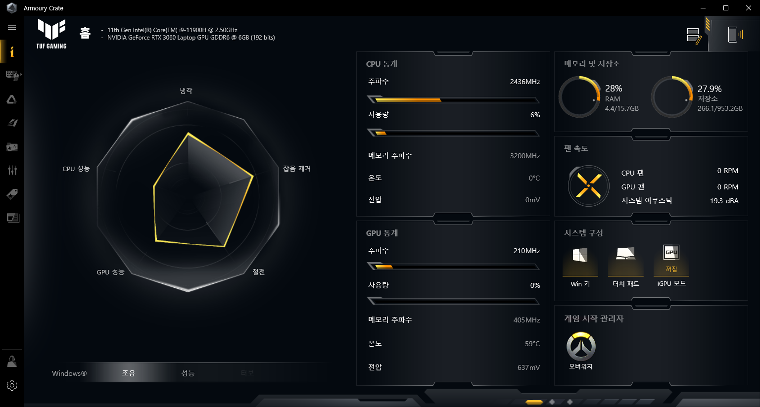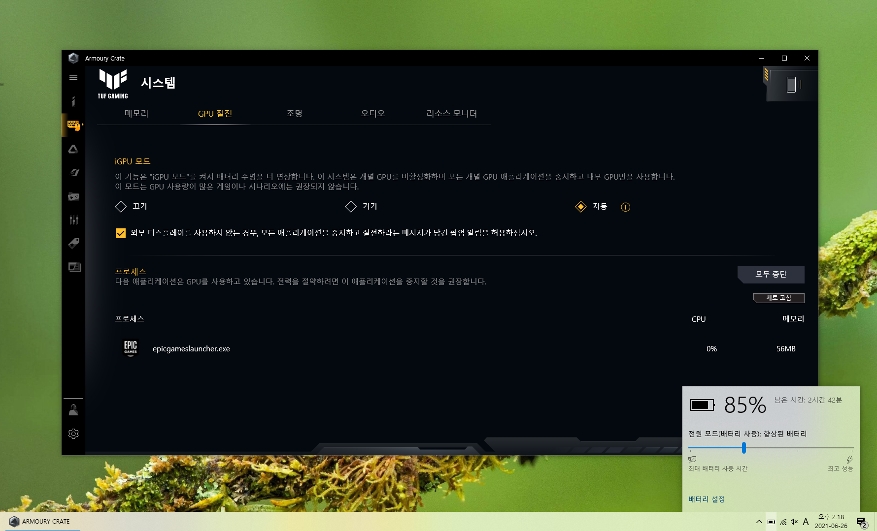 ASUS TUF Gaming F15 노트북은 시스템의 튜닝 및 RGB/오디오/디스플레이/배터리 등의 유저프로필을 적용할 수 있는 전용 Armoury Crate 유틸리티를 제공하고 있어서 최적의 환경으로 사용할 수 있다.