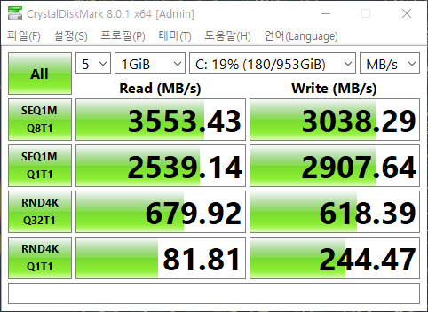 이번에는 SSD 디스크 벤치마크 결과이다. NVMe SSD가 장착된 만큼 CrystaldiskMark 테스트 결과 연속 최대 읽기속도는 3,555Mb/s, 쓰기속도는 3,038Mb/s 가 나오며 랜덤읽기 쓰기 점수도 굉장히 우수하다.