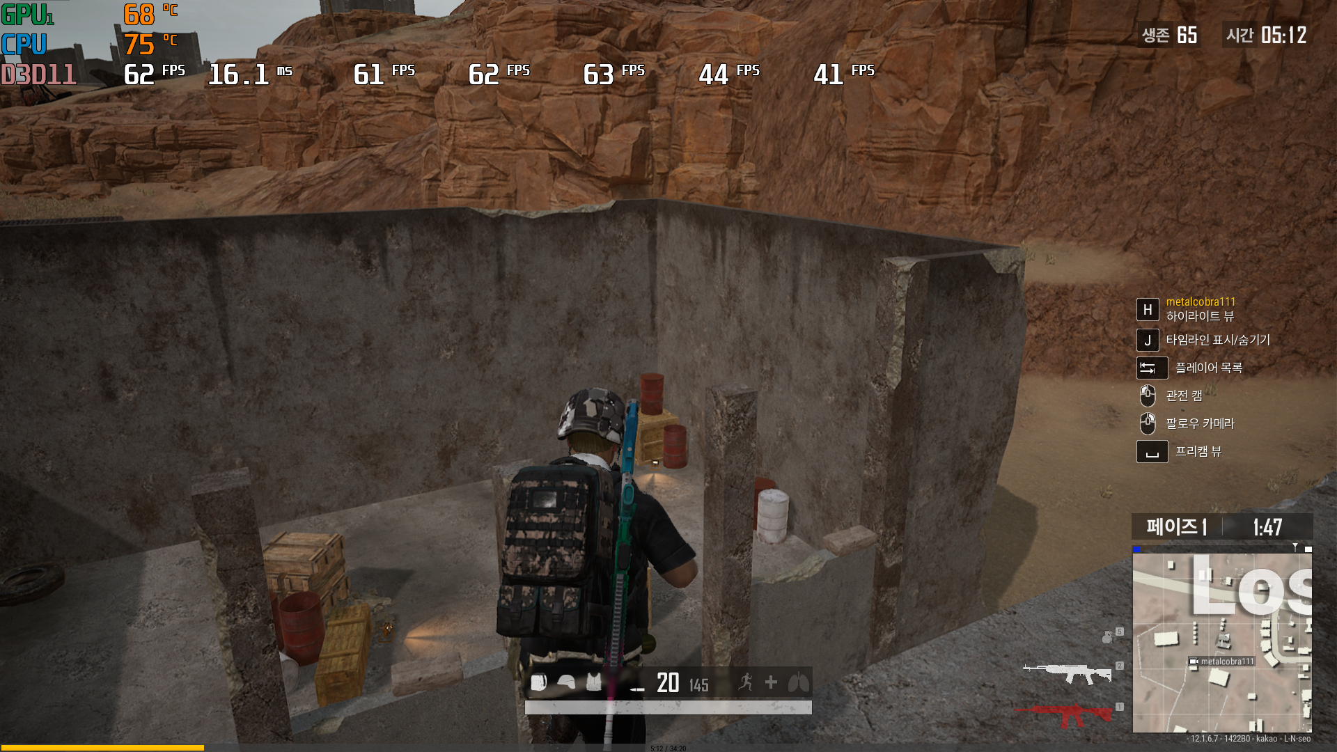 이번에는 배틀그라운드 FHD해상도 울트라옵션 기준으로 평균 프레임은 61.8, 1% 로우 프레임이 45.9 프레임이 나온다.