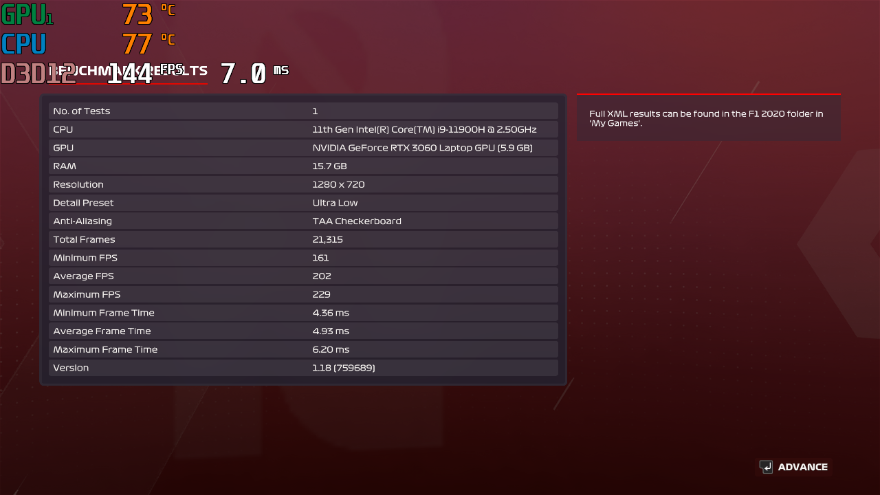 비교적 최신 게임인 F1 2020에서는 DX12 기반으로 평균 161 프레임을 보여주어 스피드한 레이싱게임을 버벅임 없이 쾌적하게 즐길 수 있다.