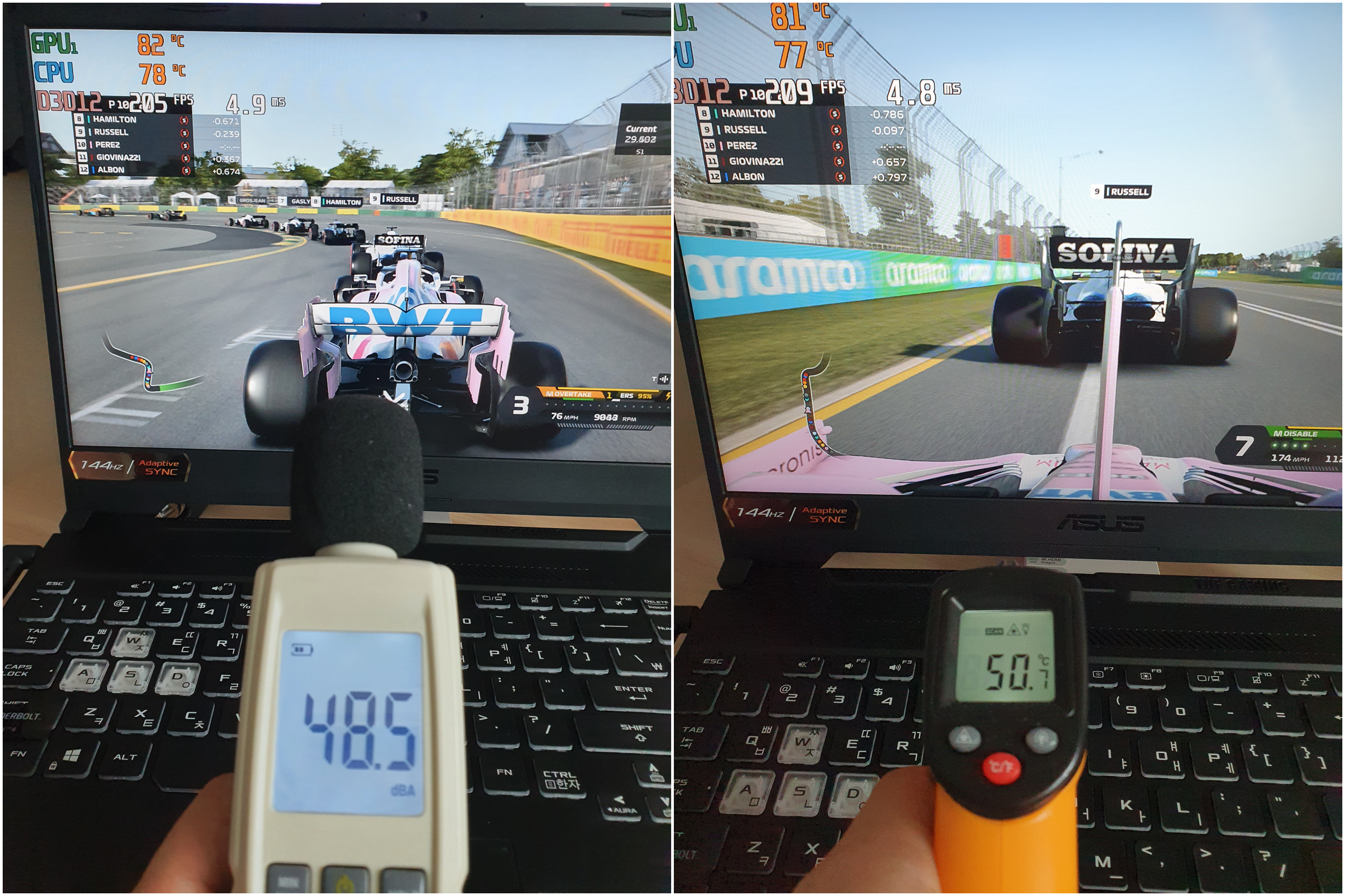 또한, 보통 게이밍노트북들이 높을 발열을 제거하기위해 팬이 고RPM으로 회전하다보니 소음이 높을 수밖에 없는데 바로 앞에서도 약 48.5db로서 상대적으로 낮은편이었다. 그리고 팜패드와 키패드는 약 35도 정도로 체온보다 낮아 발열감없이 사용할 수 있었으며 가장 높은 곳의 온도는 약 50도에 그쳤다.